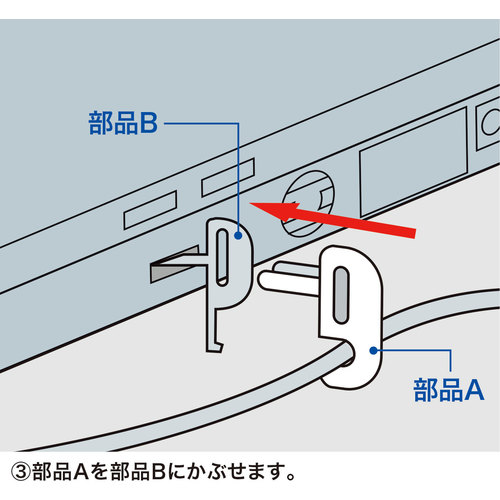 ●<使用方法>1.取り付け部品Bをセキュリティロットに差し込み90度回転させます。2.部品Aにマウス、テンキーなどのケーブルを引っ掛けます。(直径5mmまでのケーブルに対応)3.部品Aを部品Bにかぶせます。4.ワイヤーを机の脚などに巻き付けます。5.部品A・Bの穴にワイヤーを通し、鍵をかけます。