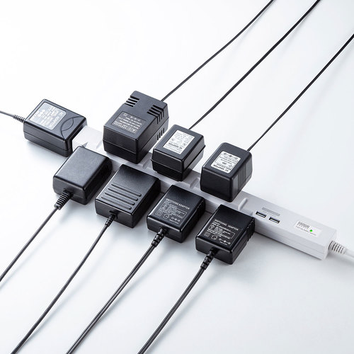 ●上面&側面交互差込口レイアウトでACアダプタ接続に便利なスリムタイオプの電源タップです。