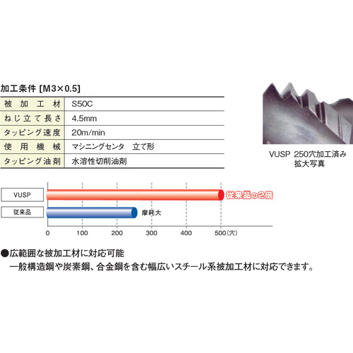 ●独自の刃形状により切りくずの排出向上と切削抵抗を低減し、良好なめねじと工具寿命を実現しています。