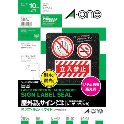 3M エーワン 屋外用サインラベル(レーザープリンタ)光沢フィルム・白 10枚入 31034