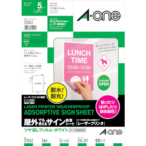 3M エーワン 屋外用サイン吸着シート(レーザープリンタ)ツヤ消しフィルム白5枚 31041