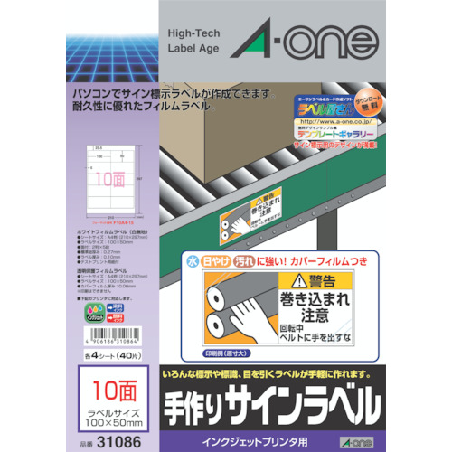 3M エーワン 屋外用サインラベル(インクジェット)光沢フィルム・白10面 4枚 31086
