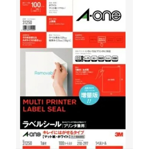 3M エーワン[[TM上]] ラベルシール(プリンタ兼用)キレイにはがせるタイプ 1面100枚 31250
