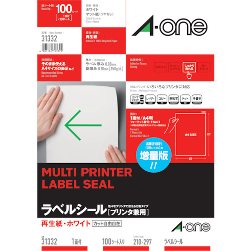 3M エーワン[[TM上]] ラベルシール(プリンタ兼用)再生紙 1面 (100枚入) 31332