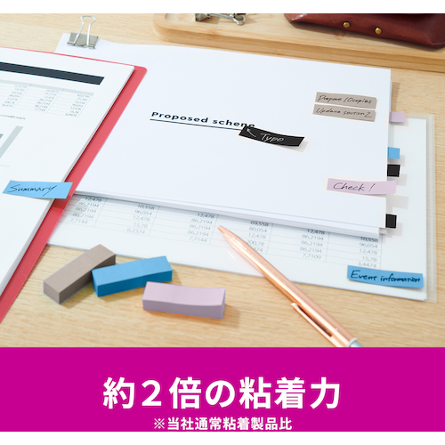 ●粘着力が2倍(当社通常粘着製品比)なので、つきにくい場所にもしっかりと貼れます。