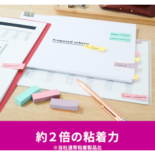 ●粘着力が2倍(当社通常粘着製品比)なので、つきにくい場所にもしっかりと貼れます。