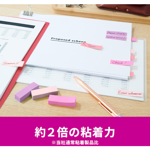 ●粘着力が2倍(当社通常粘着製品比)なので、つきにくい場所にもしっかりと貼れます。