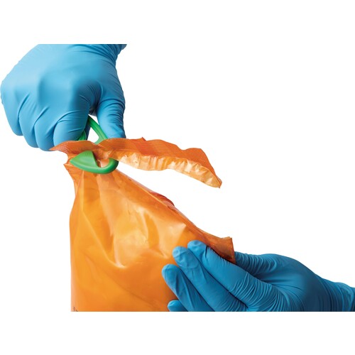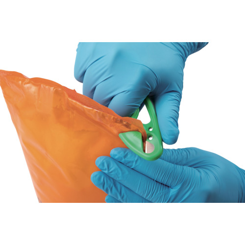 ●食品工場等で食品原料(例:水煮野菜や液卵、ミートソース、カレー、調味料など)が入った袋をカットする際に発生する異物(包材片)混入を防止することを目的として開発されたナイフです。