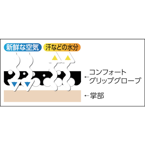 ●手のひら部のニトリルゴム面の通気性と透湿性が高く蒸れにくいため、長時間の作業もストレスなく快適です。