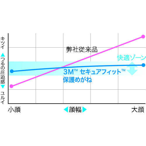 ●3M独自の圧力分散技術により、調整なしでどんな顔幅の方へも快適なフィット感を提供します。