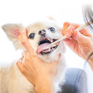 「柔らかい歯ブラシを口に当てる」→「フードまたはおやつをあげる」を繰り返し口に触れることに慣れさせましょう。