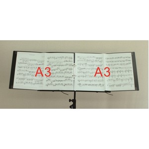 A3の楽譜を見開きで一般的な楽譜ファイルに綴じて譜面台に置くと、はみ出した両端部分が垂れ下がってしまいますが、このファイルを使うと 垂れ下がることはありません。