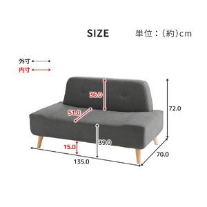 ■サイズ(約cm)/本体:幅135×奥行70×高さ72、座面高:39、座面奥行:51、背もたれの高さ:36、脚部の高さ:15