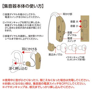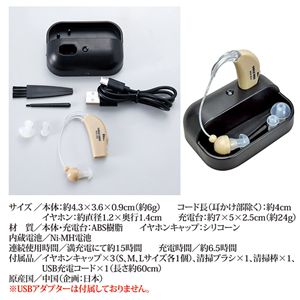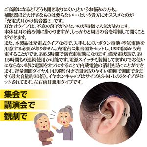ご高齢になると「どうも聞き取りにくい」というお悩みの方も。補聴器ほど大げさなものは要らない・・・という貴方にオススメなのが「充電式耳かけ集音器2」です。耳かけタイプは、不意の落下が少ないのが特徴で人気があります。本体は耳の後ろ側に掛かりますが、しっかりと周囲の音を増幅して聞くことができます。また、本製品は充電式タイプなので、入手しにくいボタン電池・空気電池を用意する必要がありません。充電台に集音器をセットし、USB電源から充電することができ、約6.5時間で満充電状態になります。満充電状態で、約15時間もの連続使用が可能です。電源スイッチも装備してますのでお使いにならない時は電源をオフにすることで内蔵電池の消耗も防ぐことができます。音量調節ダイヤル(4段階)付きで聞き取りやすい範囲で調節できます(最大音量約30倍)。イヤホンキャップはサイズもS・M・Lの3タイプがセットされてます。左右両耳兼用タイプです。