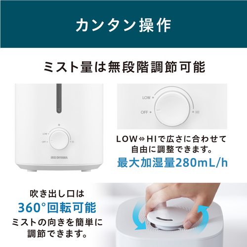●加湿量は、LOW⇔HIで、お部屋の広さなどに合わせてお好みで調節できます。