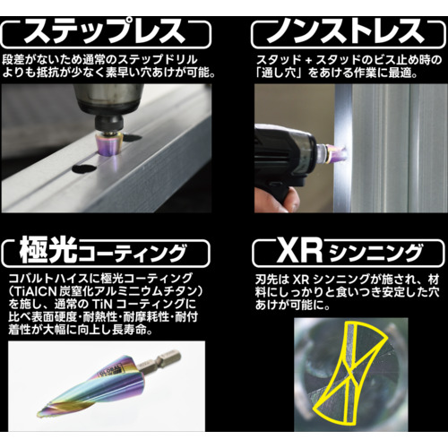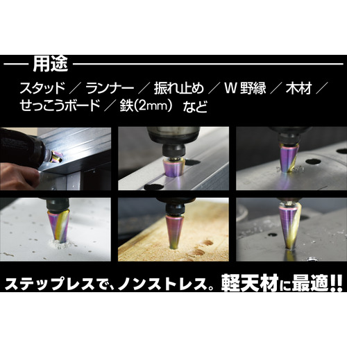 ●段差がないため通常のステップドリルより抵抗が少なく素早い穴あけが可能です。