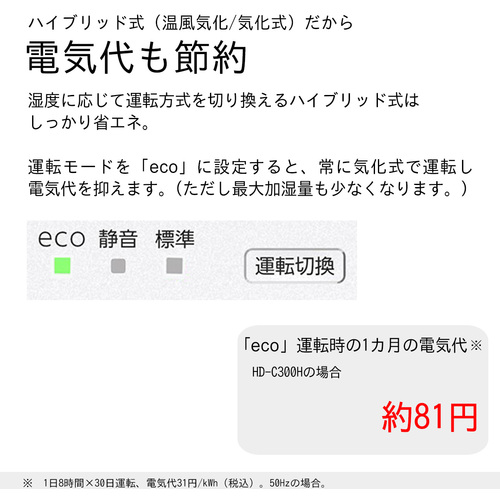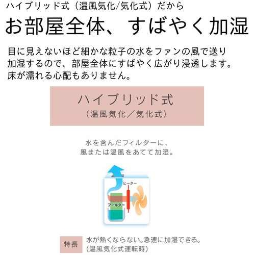 ●気化式と温風気化式のハイブリッド式なので、乾燥している時は素早く加湿し、湿度が安定すると運転を抑え経済的な運転を行います。
