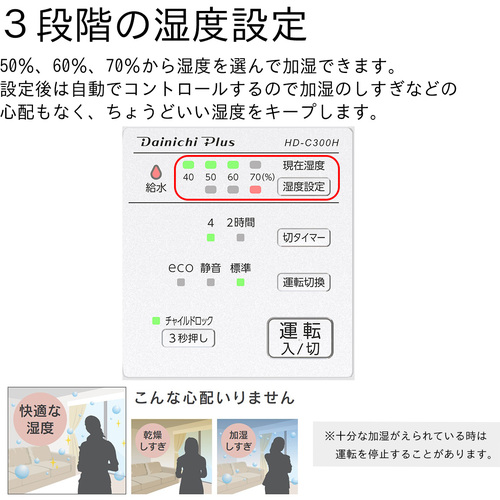 ●50~70%の10%単位でお好みの湿度を設定できます。