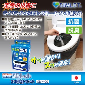 地震などの災害時、万が一、送電や水道がストップしたら困ってしまうのがトイレです。防災のための備えとして、避難用具や食料品などは思いついても、排泄のことまで考えて備える人は少ないようです。しかし、実際にはライフラインがストップすると、トイレでの排泄はできなくなってしまいます。実際、東日本大震災では、トイレ難民が約82万人も出ました(中央防災会議の専門調査会調べ)。そんな時でも排泄ができるよう作られたのが「シムレット」です。排泄物を固めてしまうのはもちろんのこと、イヤな悪臭を特殊な活性炭(ヤシガラ活性炭)を配合することで臭いも抑えることができ、抗菌剤も配合しているので安心して非常時でもトイレが使用できます。