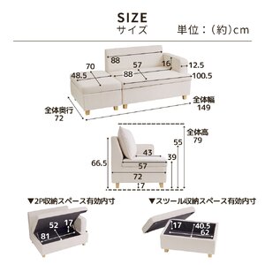 ■収納部内寸(幅×奥行×高さ/約cm)/ソファ座面下:81×52×17、オットマン下:40.5×62×17