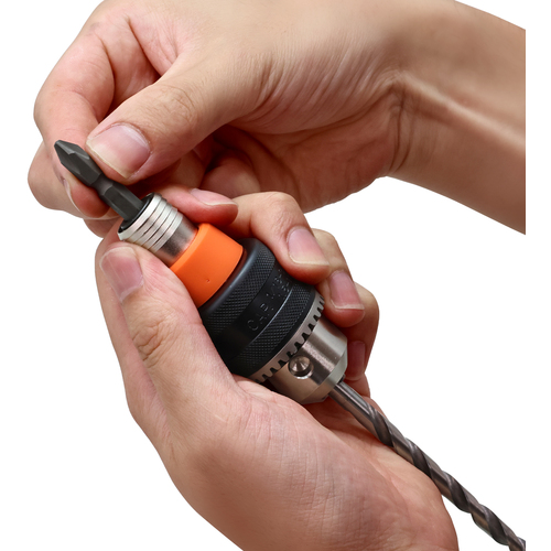 ●充電ドライバーに取り付けてドリルでの穴あけ、軸付砥石での研磨作業に。