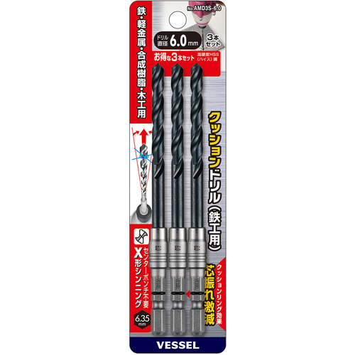 VESSEL クッションドリル(鉄工用)3本組 Φ6.0 全長127mm AMD3S-6.0