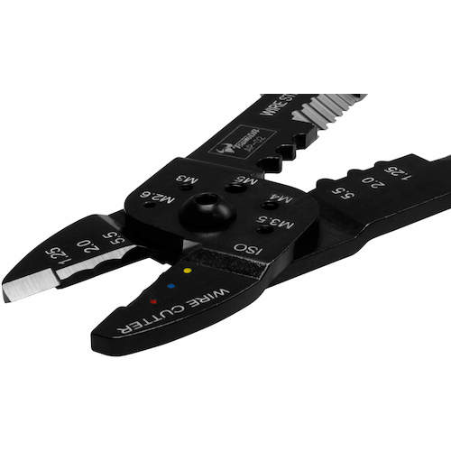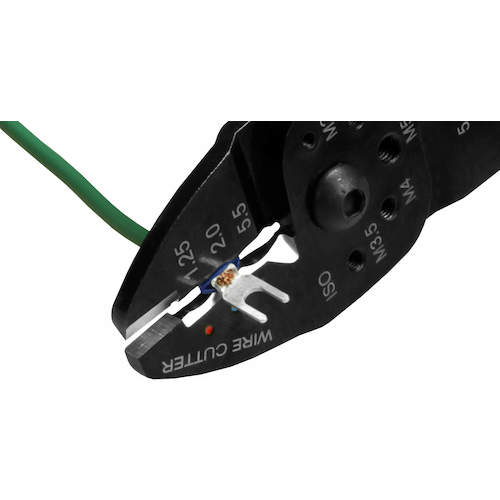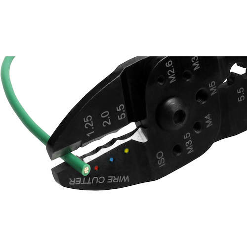●これ1本で電気配線に必要な5つの機能(ワイヤーカッター、絶縁端子圧着、ボルト・ネジの切断、裸圧着端子圧着、ワイヤーストリッパー)を装備しています。