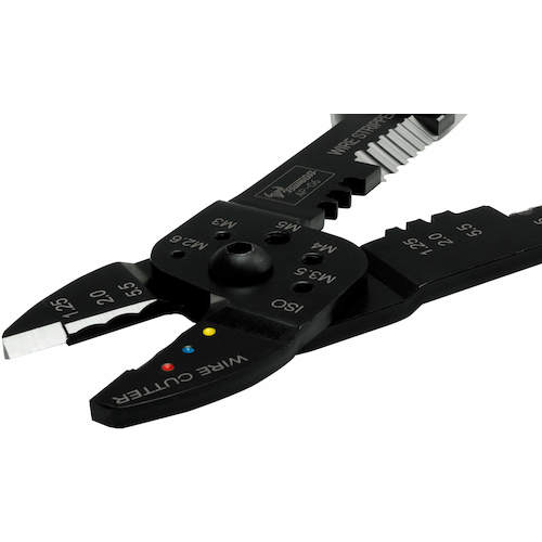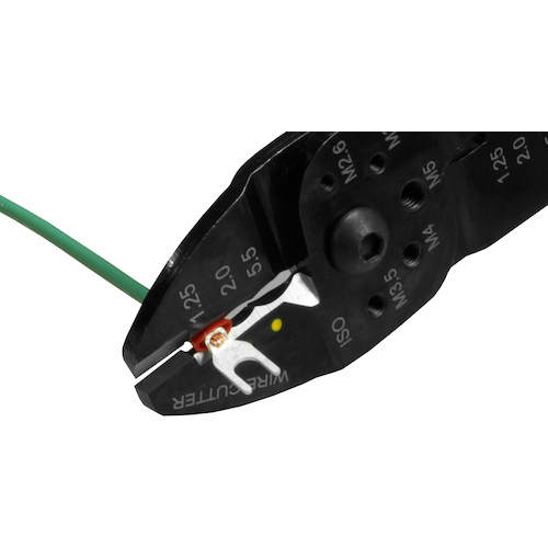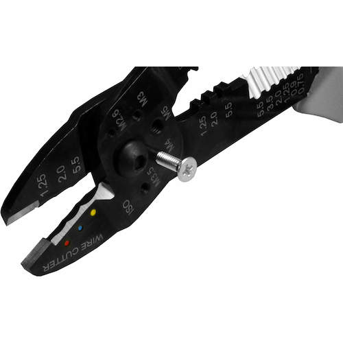 ●これ1本で電気配線に必要な5つの機能(ワイヤーカッター、絶縁端子圧着、ボルト・ネジの切断、オープンバレル端子圧着、ワイヤーストリッパー)を装備しています。